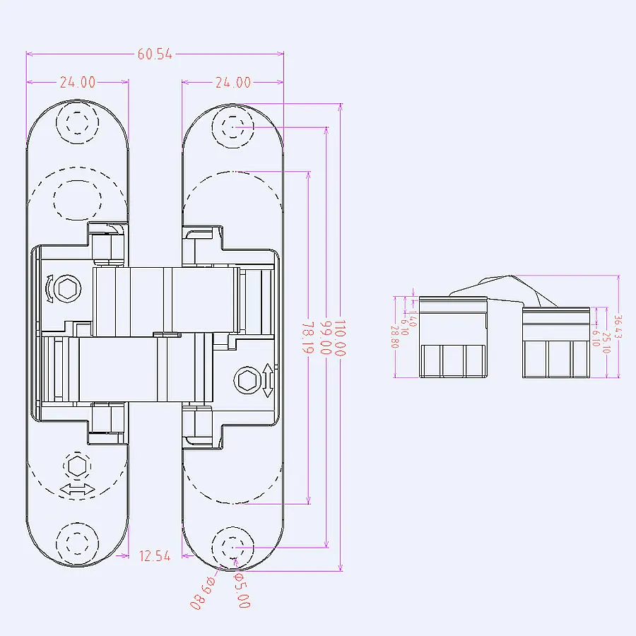 Adjustable concealed hinge for flush doors. Shengang hardware offers wide settings on three axes. The sash movement is fluid and precise until 180°. The cover conceal the adjustment screws, for elegance also when the sash is open. Suitable for wood doors, flush doors, swing doors etc.