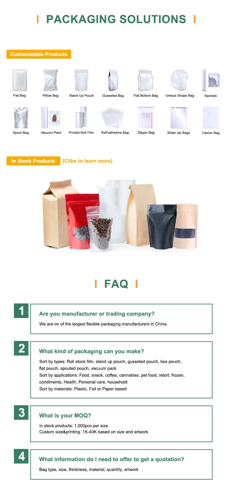 | About MOQ | MOQ based on 1. Bag type, 2. Size |