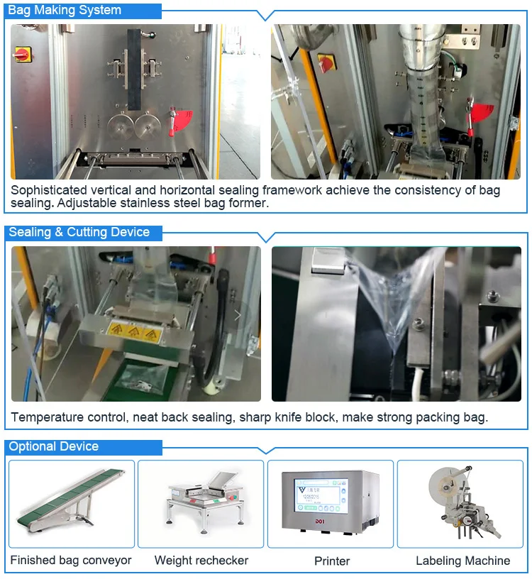 4. Solid sealing, smooth and elegant bag shape; high efficiency and durability, can be equipped with exhaust device, printer,labeling machine, transfer conveyor and weight checker.