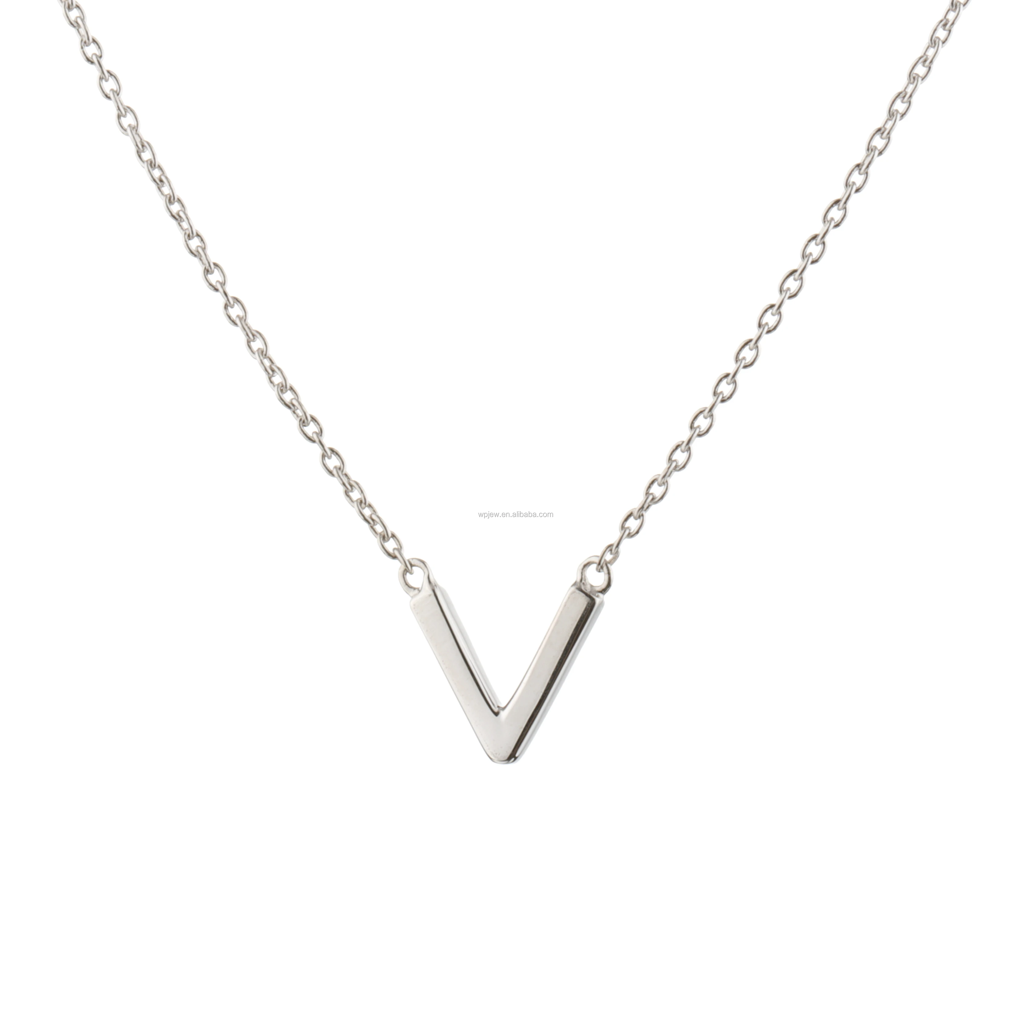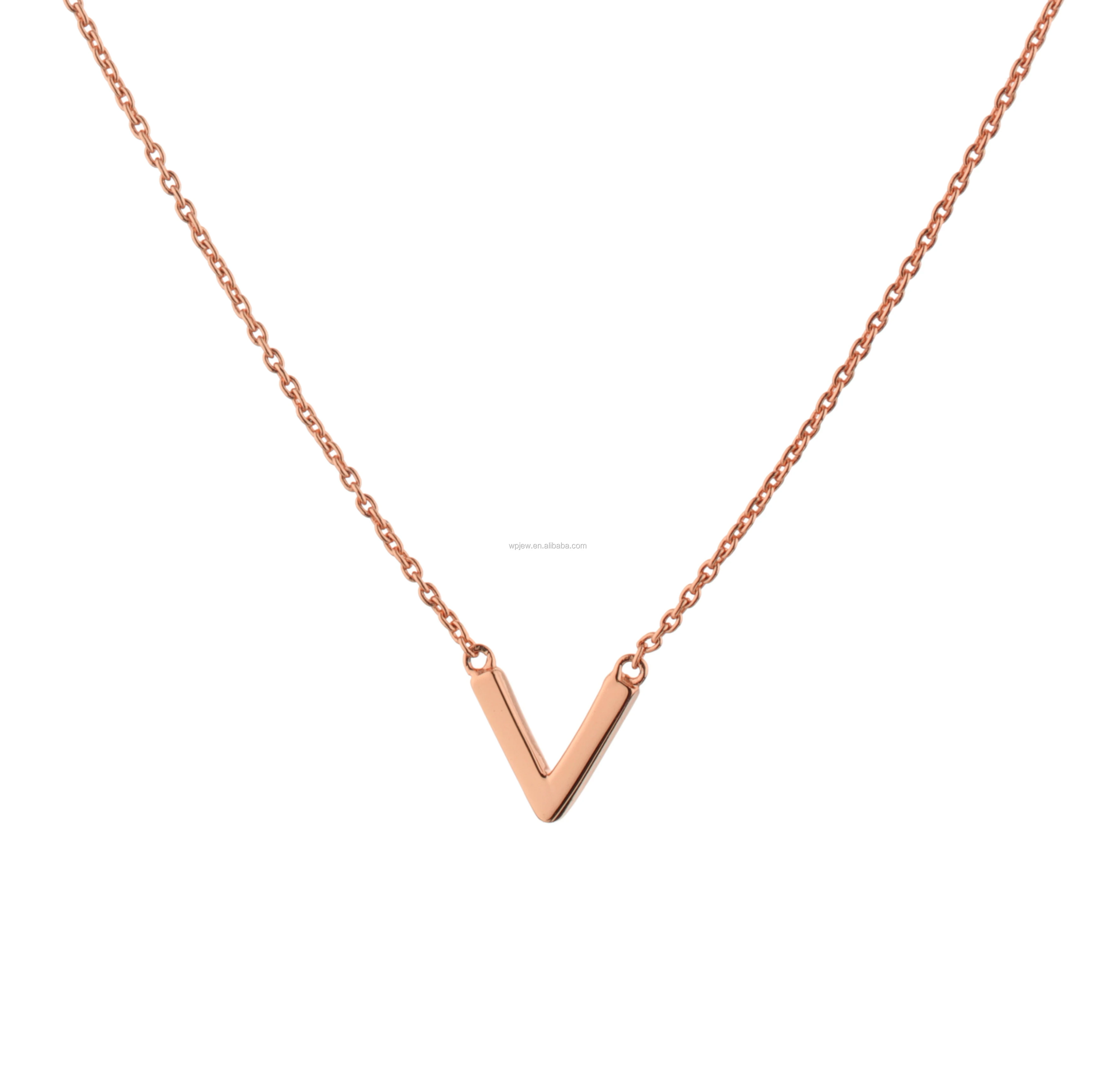 Capital letter V shape necklace made by 925 sterling silver in gold, rhodium or rose gold plated. Features adjustable length chain and lobster clasp.