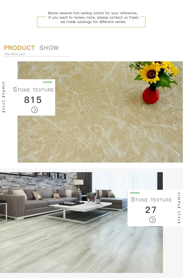 Product Dimension(mm) | W:457.2 H:1.8/2.0 L:457.2 | Wear layer(mm) | 0.07/0.1/0.2 |
