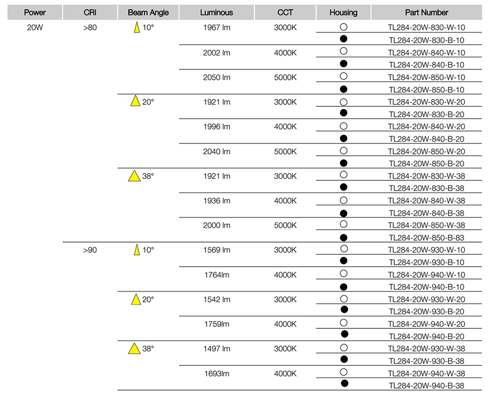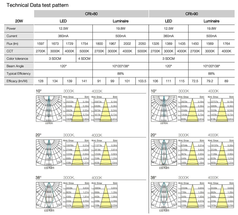 | Beam angle | 10°,20°,38° |