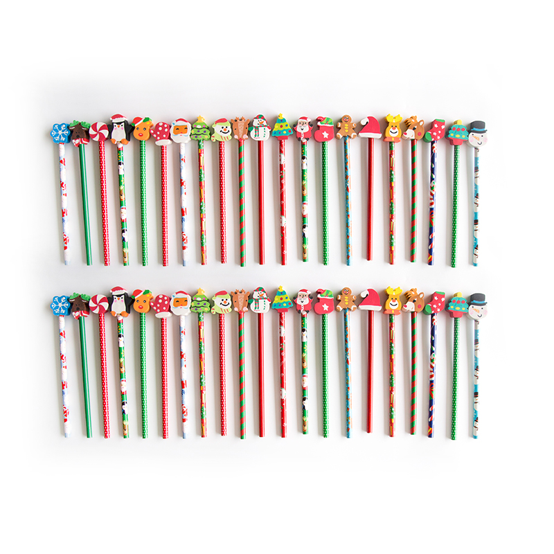 Standard HB pencils with colored rods and colorful erasers.