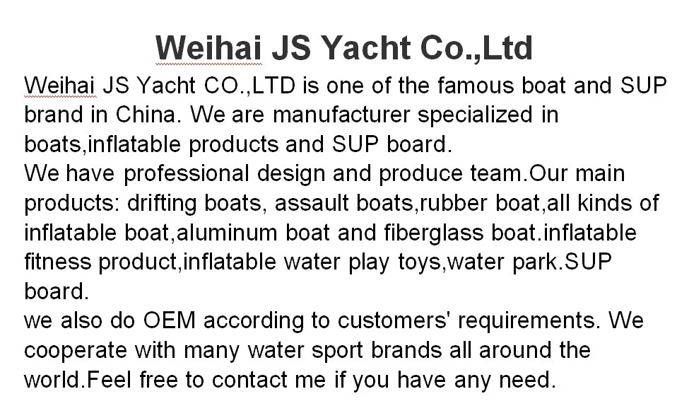 JS PVC 3.8m hot sale inflatable boat was manufactured using the PVC(0.9mm).Highly resistant to damage from abrasion, impact and sunlight. The fabrics are all connected by HAND MADE gluing, which makes the boat very strong at seam.This boats adapt to Surfing,lifesaving,communication repairation,patrol around the reservoir or fishing.