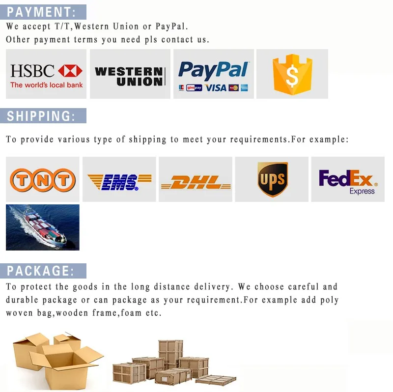 6.Easy and multiple payment:Bank transfer,T/T,Western Union,Paypal and so on.