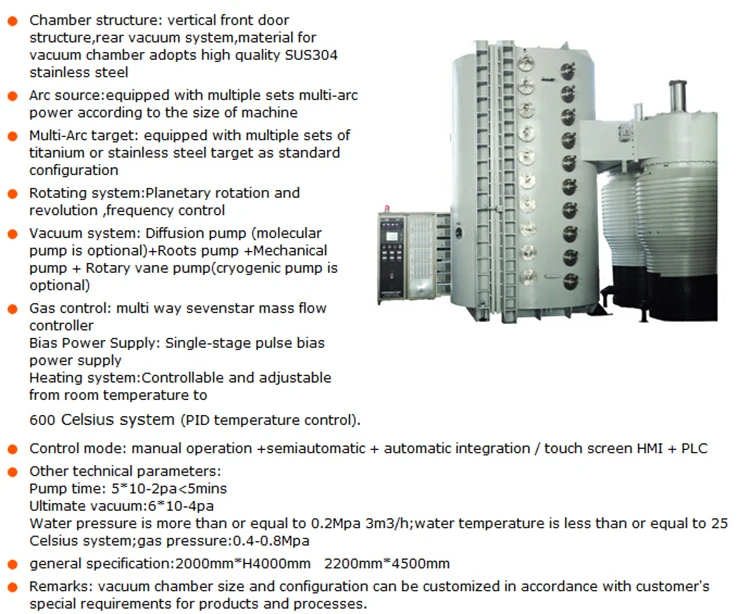 The machine adopts the multi-arc coating way, it is a vertical type or horizontal type and with one open door or double doors.