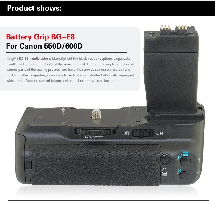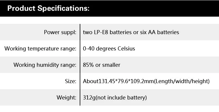 | 8 | Suitable | For CANON 550D/600D/650D/700D/Rebel T2i Digital SLR Camera |