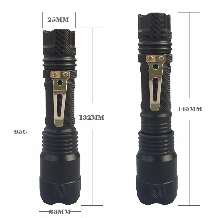 1 | Lighting Source | 1*XML T6 | 14 | Product Size | Head: 33mm Tail: 25mm Total Length: 132mm(Zoom Out) 145mm(Zoom In) | |||||