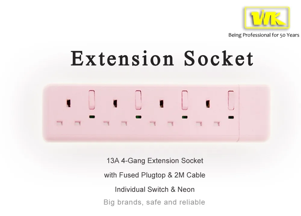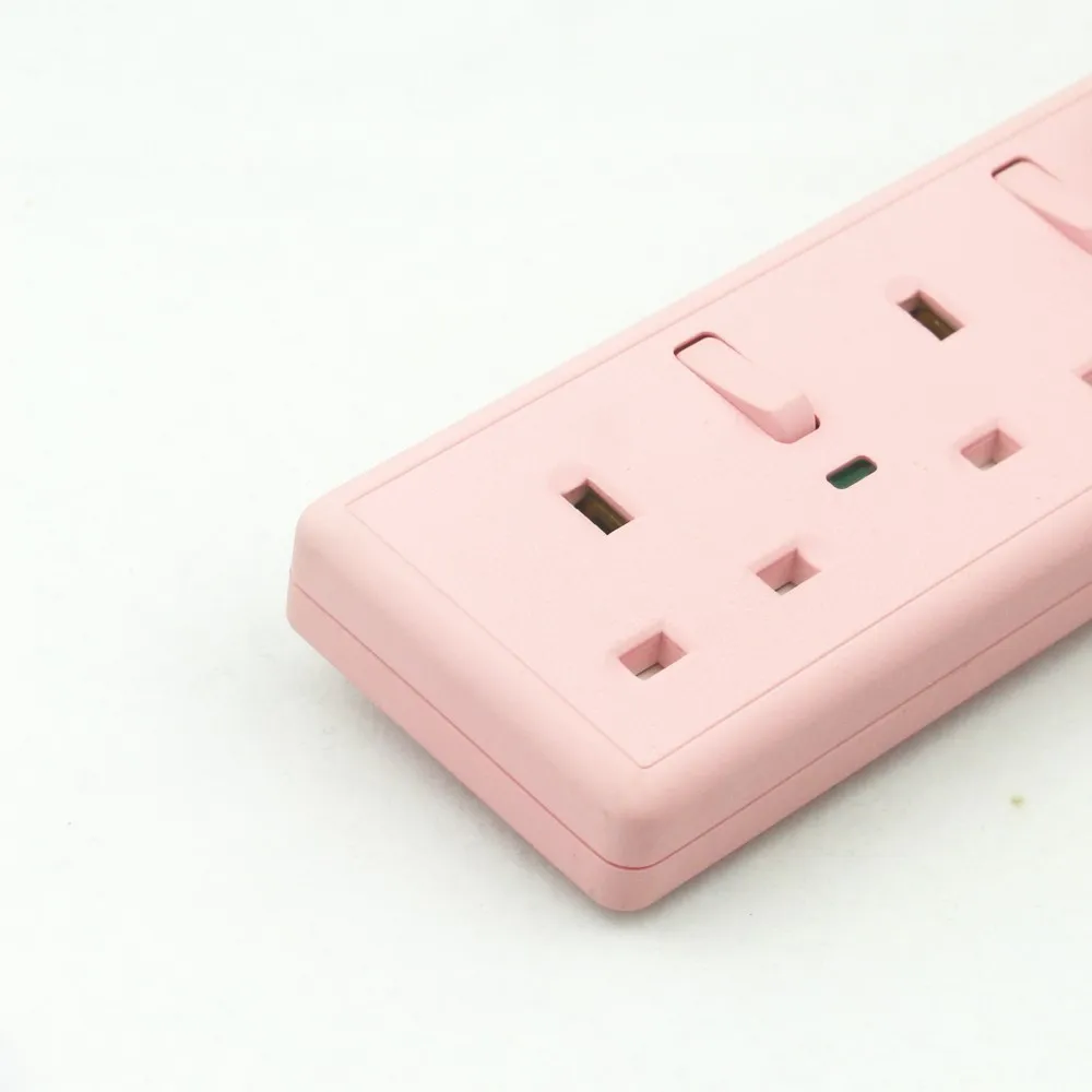 WK Color Customized Girl Stylish Pink 13A 4 Gang Extension BS Socket with UK Fused Plug Top, Individual Switch & Neon