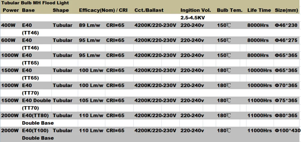 New design E40 220v ballast T38 400W Super lumen metal halide lamp outdoor mh flood light and grow plant lighting