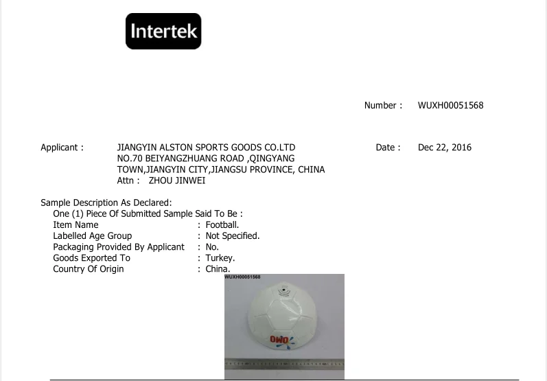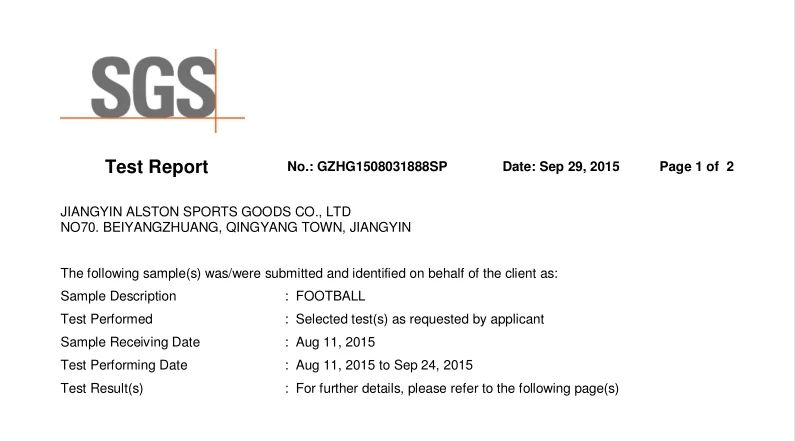 ALSTON SPORTS factory has pass the test by SGS.Test Conducted: Based on GB/T 22892-2008 Football.