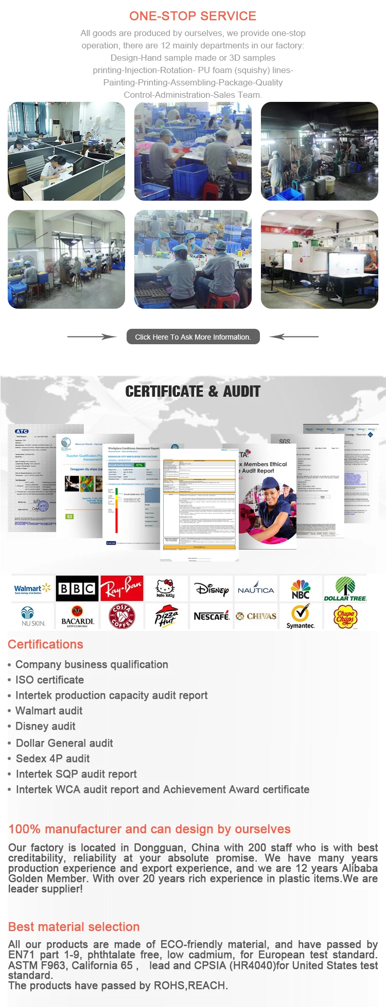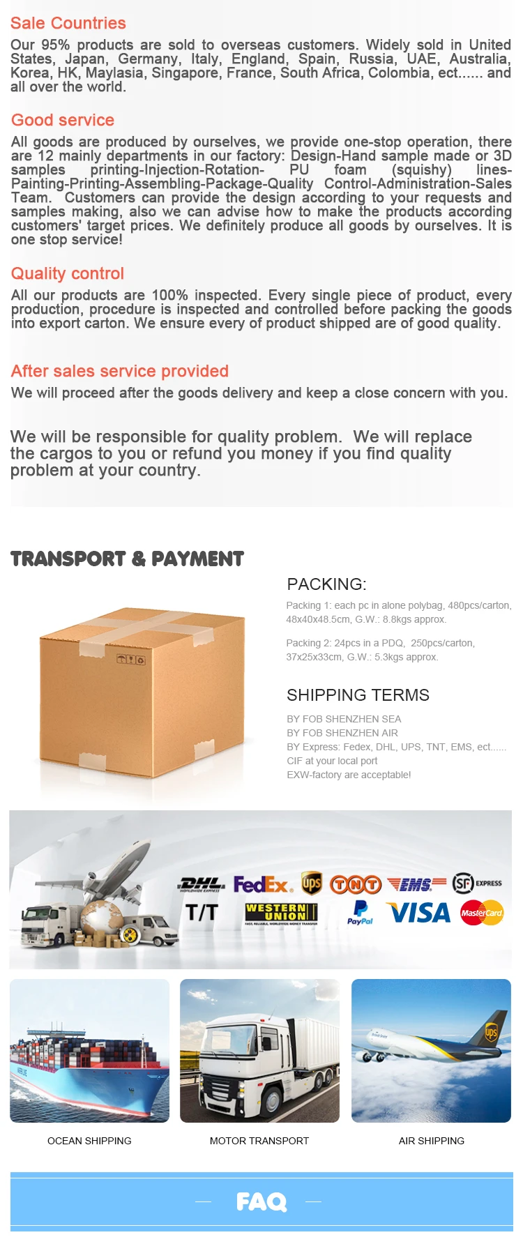 1. We prvide customers one -stop operations,There are 11 mainly departments in our factory:Design-Hand sample made-Injection-Rotation-Painting-Assembling-Package-QC-Administration-Sales team.