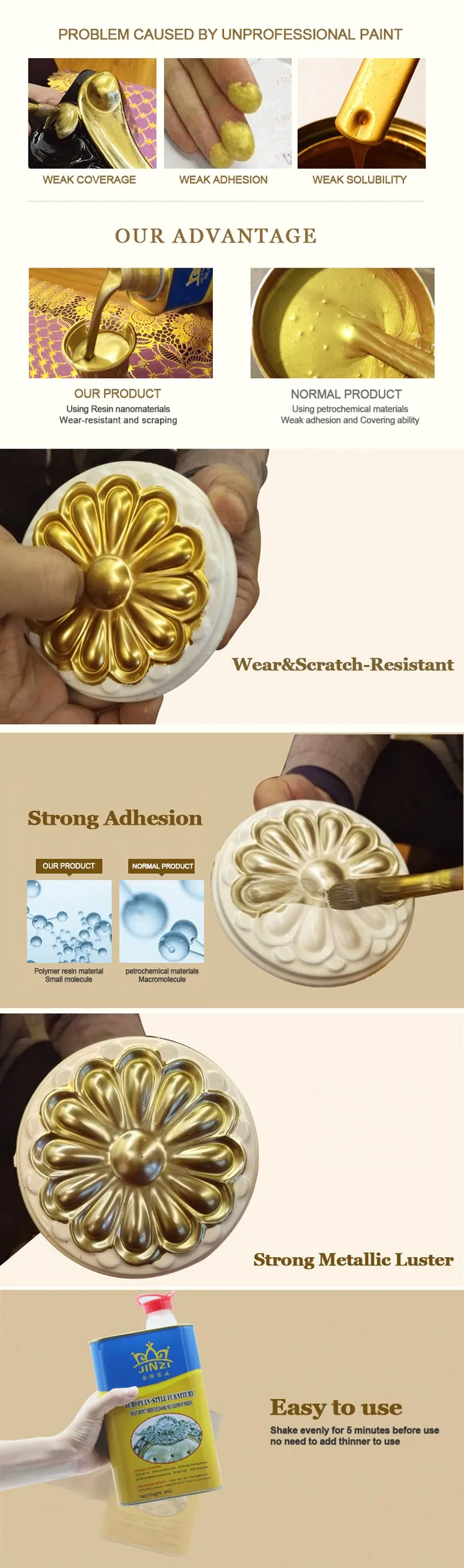Produced by the uniform thickness, color and consistent quality and stability, widely used in European and American furniture, picture frames, glass art, mobile phone shell, gold mask, temples, statues, crafts, interior decoration and other areas. Companies adhering to the "Integrity and Innovation " business philosophy dedicated to the vast number of old and new customer service.