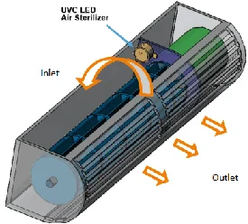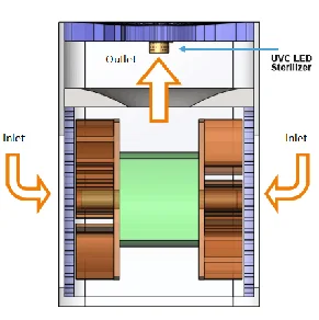 This sterilization module focuses ultraviolet light (the view angle is about 60° as shown in Fig.3, and UV radiation outside the 60° view angle is <5%). It is best installed in the narrow interior spaces of air purifiers as light will not be easily blocked or absorbed by the appliance, boosting up UV utilization rate.