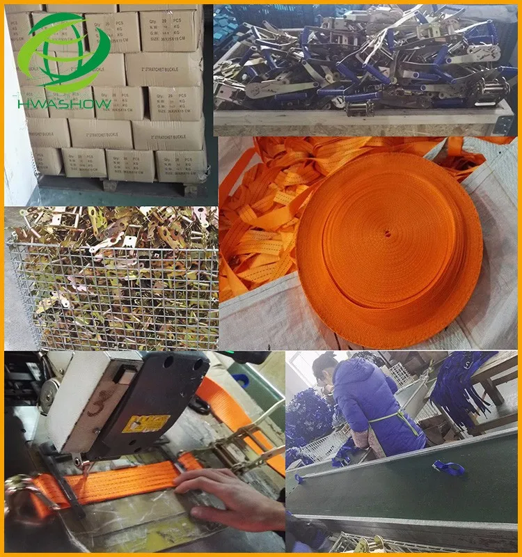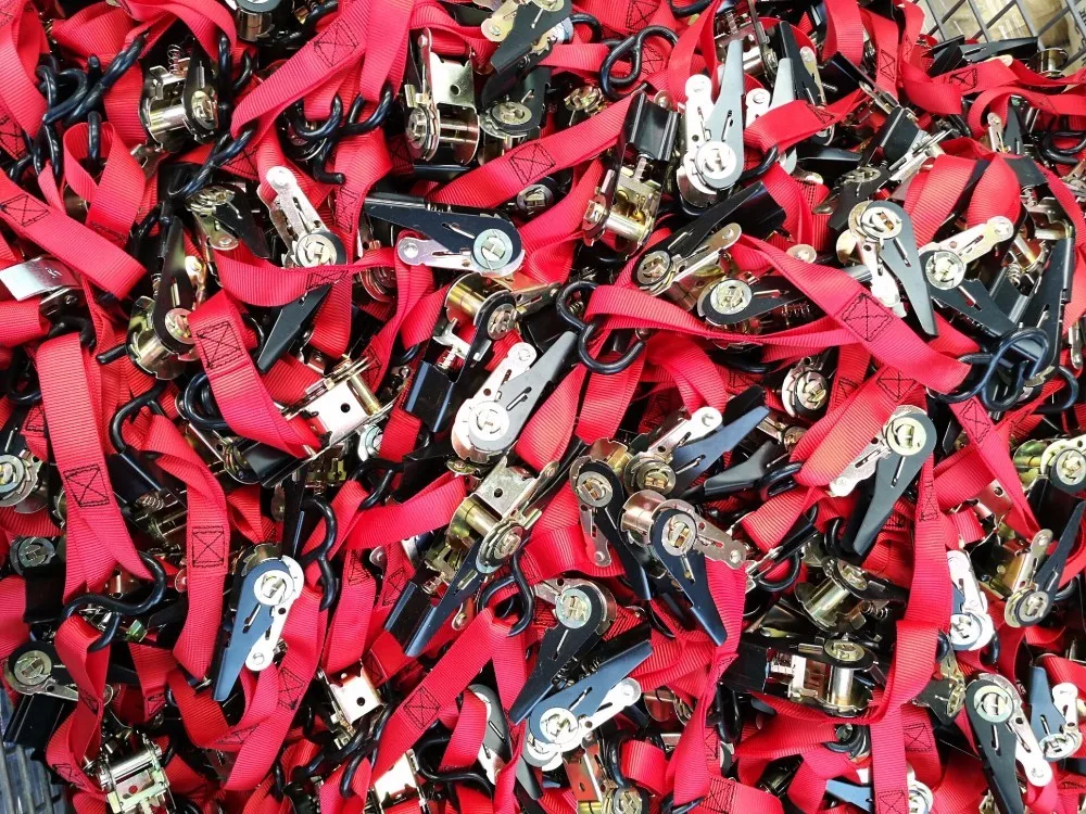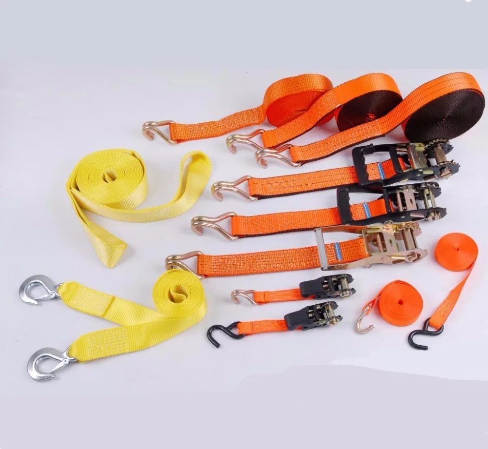The material for our ratchet straps is polyester/nylon webbing. Each strap is securely stitched around the ratchet appliance and end fitting. 1'' Straps are available with wire hooks, snap hooks, s hooks and d-rings, 2" ratchet straps have various attachment hardware: flat hooks, snap hooks, wire hooks, grab hooks, s-hooks, buckles, and chain are some of the end fittings that ratchet straps use to secure the your cargo. or you can choose an endless strap for your ratchet tie-downs.