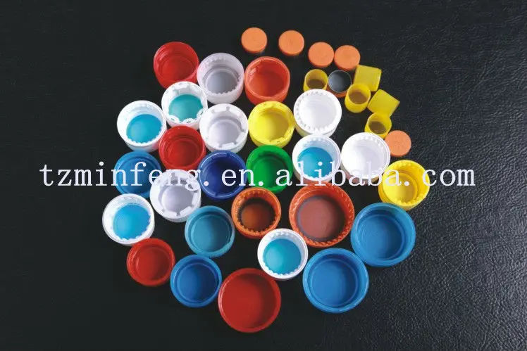 Bottle caps are made from plastic granular raw material which is fed via the hopper, fluidized with high temperature, and then forms die block that is extruded from the discharge outlet of the extruder, cut with the cutting tray, uniformly distributed into each die cavity and finally mould pressed.