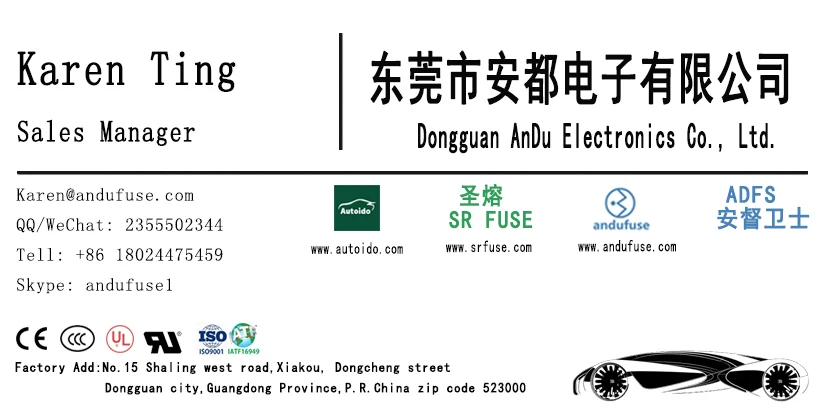 Dong Guan Andu Electronics Co., Ltd is founded in 2000 years, Our products are vital components in virtually every market that uses electrical energy, from consumer electronics to automobiles, commercial vehicles and industrial equipment. Our history of innovation, proven technical expertise and the industry's broadest and deepest portfolio of circuit protection products enable us to provide objective, comprehensive solutions for each customer's unique needs. Our products cover SMD fuse, SMD PPTC fuse, resistance type microfuse ,plastic microfuse, glass tube fuse, ceramic tube fuse, temperature fuse(thermal cutoffs):ceramic shell and plastic shell temperature fuse, copper shell temperature fuse , electric cars fuse, auto fuse, auto fuse holder, current fuseholder, temperature control switches, high voltage fuse, photovoltaic fuse , plug-in resettable fuse, and so on. All the product have gotten UL, VDE, CCC, CQC, CSA certification, and have high quality and competitive price.