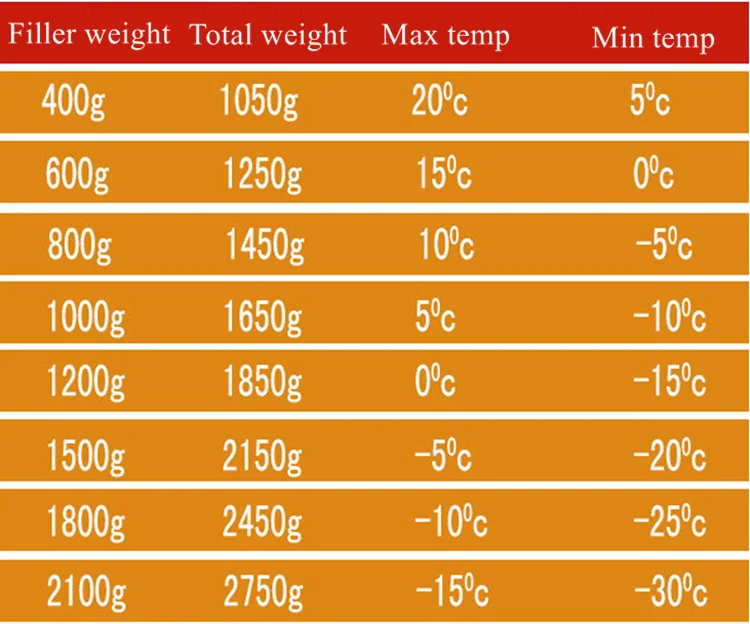 | Model | Length cm | Temperature | Weight gram | Down weight | Down | Cuin | Width cm | Location Zipper | Shape |