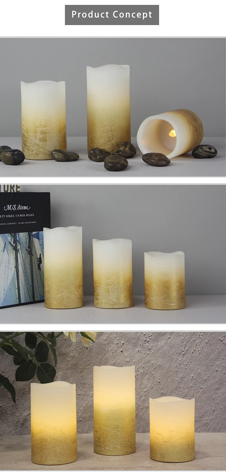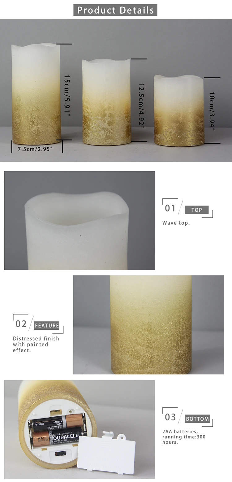 | Product Name | SET OF 3 BATTERY OPERATED REAL WAX FLICKERING LED CANDLE, WITH TIMER FUNCTION, WITH GOLD METALLIC OMBRE DISTRESSED FINISH |