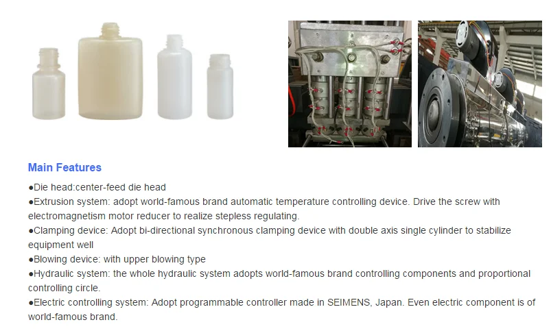 The machine is single station with single die head, which is specially designed for 2L as maximum volume,suitable for HDPE,PE,PP,PVC,PETG and other materials for blow moulding.