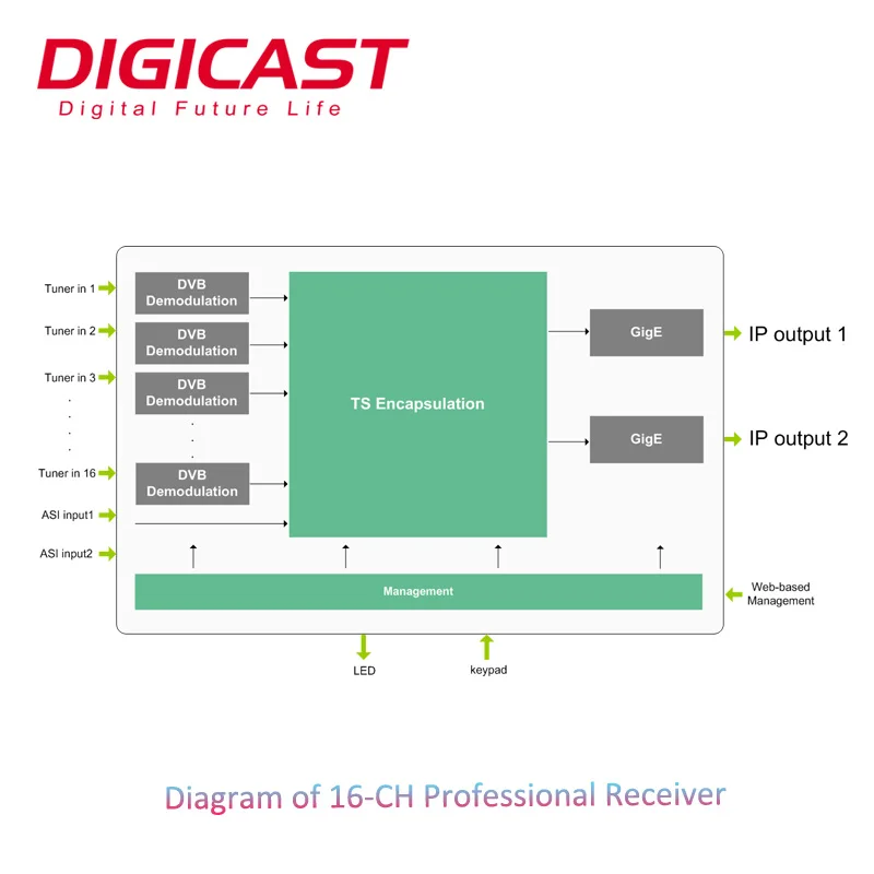 DMB-9016B 16 Channel professional Receiver works with TS over IP technology. De-modulate the Tuner signals to DVB-ASI signals, encapsulating TS over IP signals for transmission via Internet. Meanwhile capable of multiplexing, BISS descrambling, DisEqc. This Multi-Channel Professional Receiver accept 16*Tuners (DVB-S/S2/T/T2/C/ISDB-T optional) input, DE-modulate to 2*ASI(independent) output and encapsulate to IP packet. It supports 16 MPTS or 512 SPTS output over UDP and RTP/RTSP protocol through different IP address and ports.
