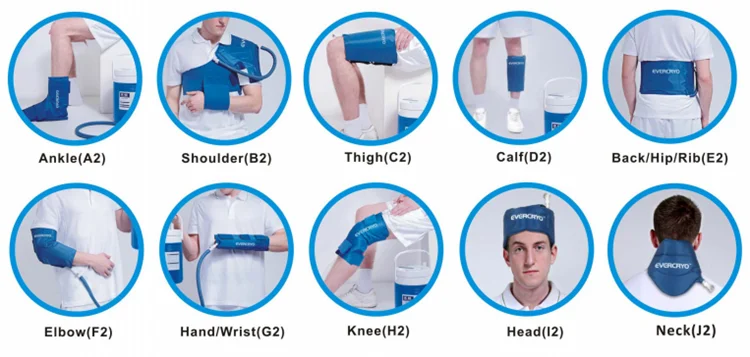 The Evercryo series cryo cuff with cooler is a new medical device that combines compression with cold to control swelling, edema, hematoma, hemarthrosis, and pain in the joints . Simplicity of design and ease of operation makes it ideal for the medical institutions,plastic operation,gym,home and so on. Such as follows: