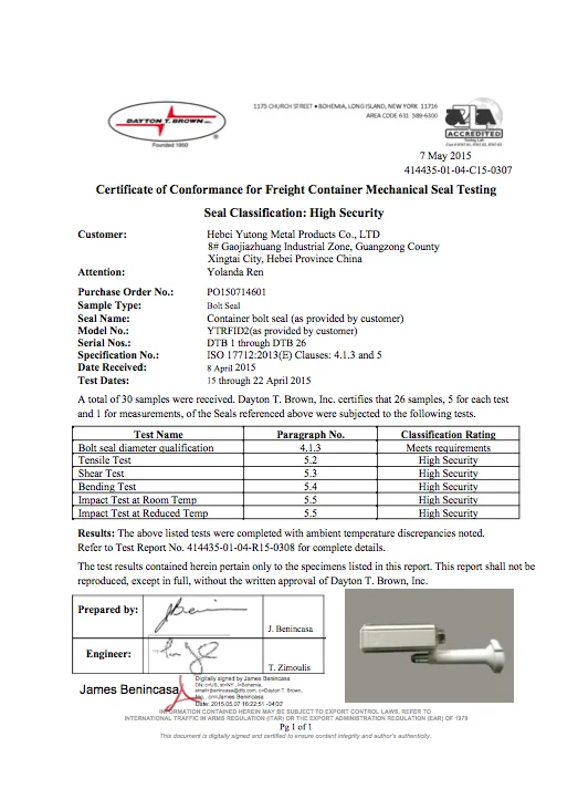 ISO 17712-2013, Clause 4 and 5 test certificate of Dayton T. Brown, INC. | UHF RFID E seal can't read any RFID DATA before use. | ||||||