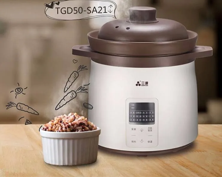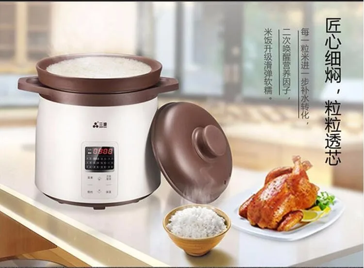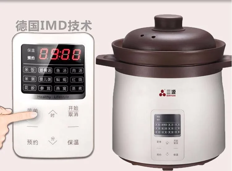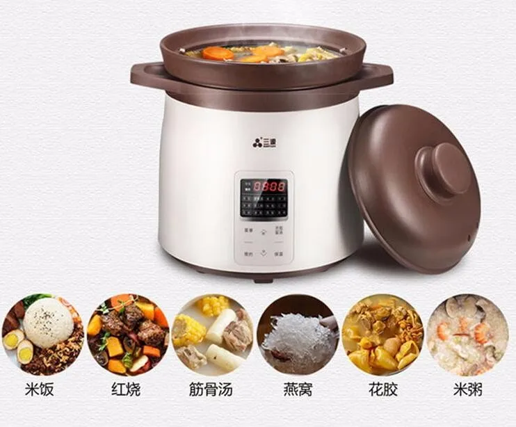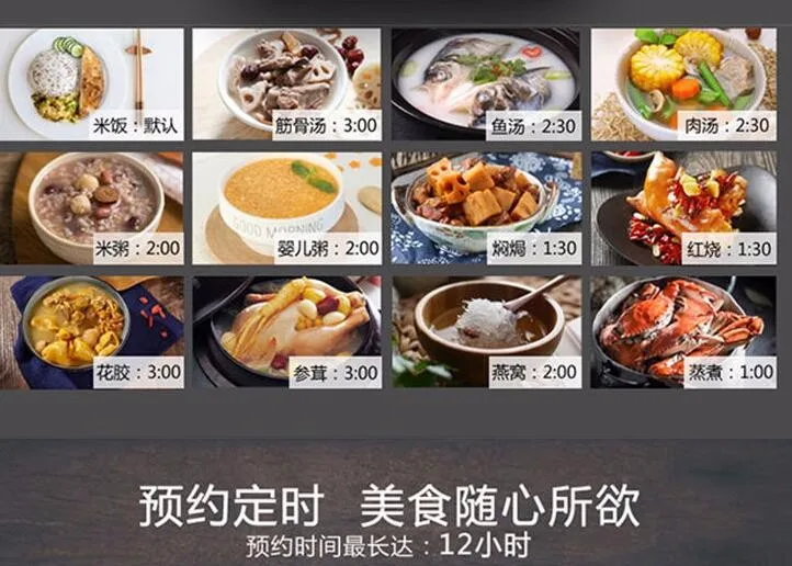 5. Multi-functions choices: rice, tendon soup, fish soup, meat soup, porridge, BB porridge, simmer, braise, fish maw, ginseng antler, bird's nest, steam cook, preset, keep warm