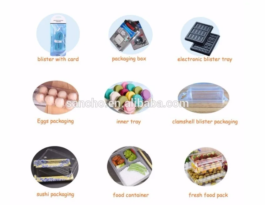 Sancho Thin-gauge thermoforming products include blister packaging, clam-shell, food container, plastic trays for a variety of applications: electronics, food, cosmetics, toys, hardware tools, stationery, We process thicknesses from 0.006" thick to 0.08" thick with material PET, PVC, PPC, OPS, ABS, PC Antistatic, conductive, flocking.