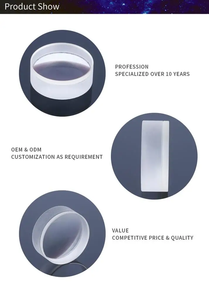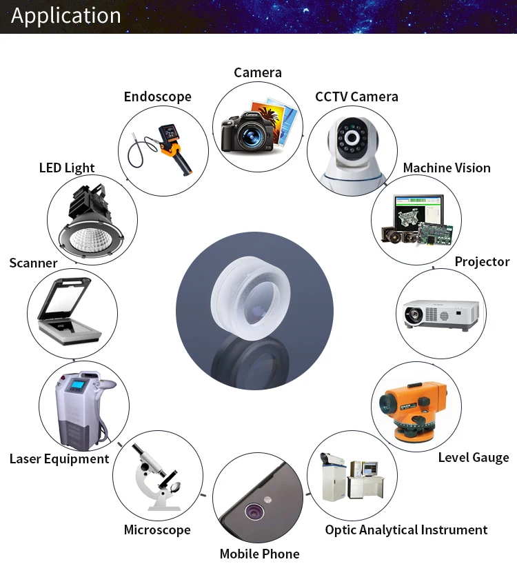 We are specialized in optical design,optical element processing,Lenses assembly,Such as Spherical lens,Aspherical lens,Cylindar lens,Reflector mirror,Filter,Rod lens,Camera lenses etc,and our products are wide used to these filed such as imaging,Laser,Lighting etc.