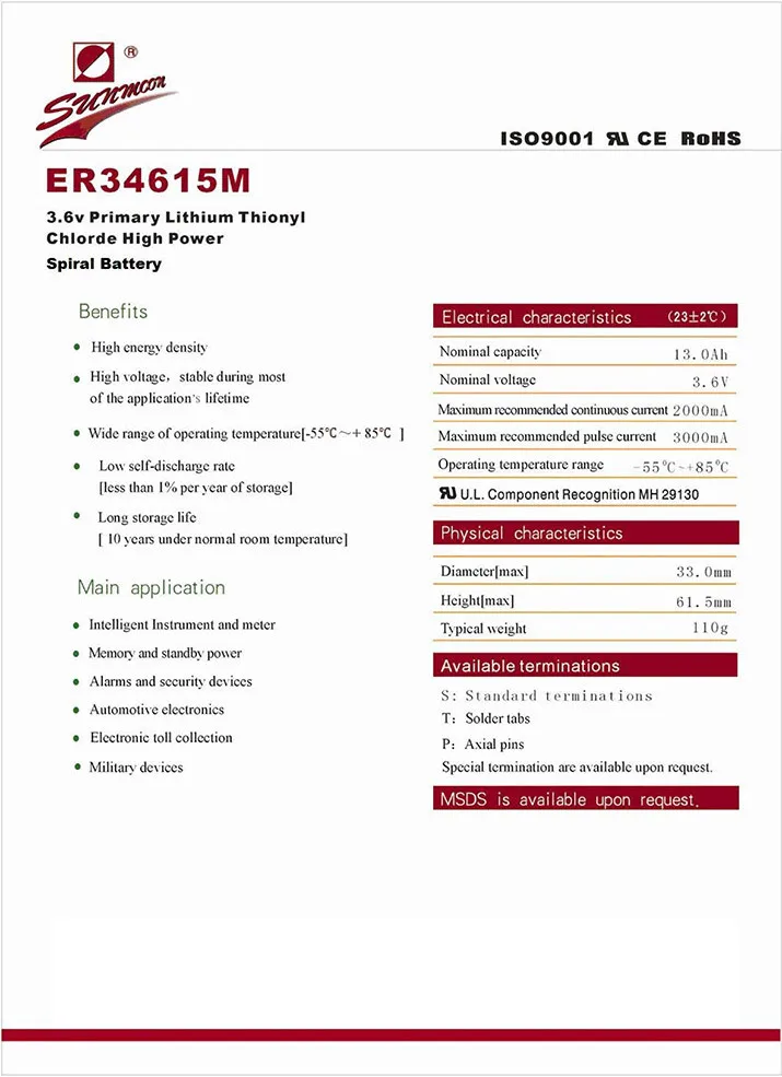 Lithium Thionyl Chloride Battery Specification (High Energy)