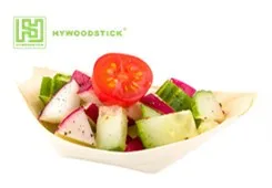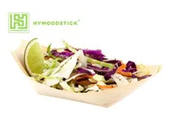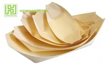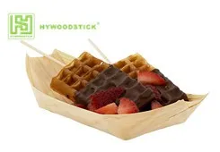 Stylish, disposable, small, wooden "boat" serving dishes made from thin sheets of pine wood.