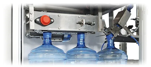 The bottle takes the cap directly from the canal chute. The snapping of the cap on the bottle neck is carried out through the pressure developed by a belt conveyor, provided with a system to adjust the force in order not to stress the bottle.