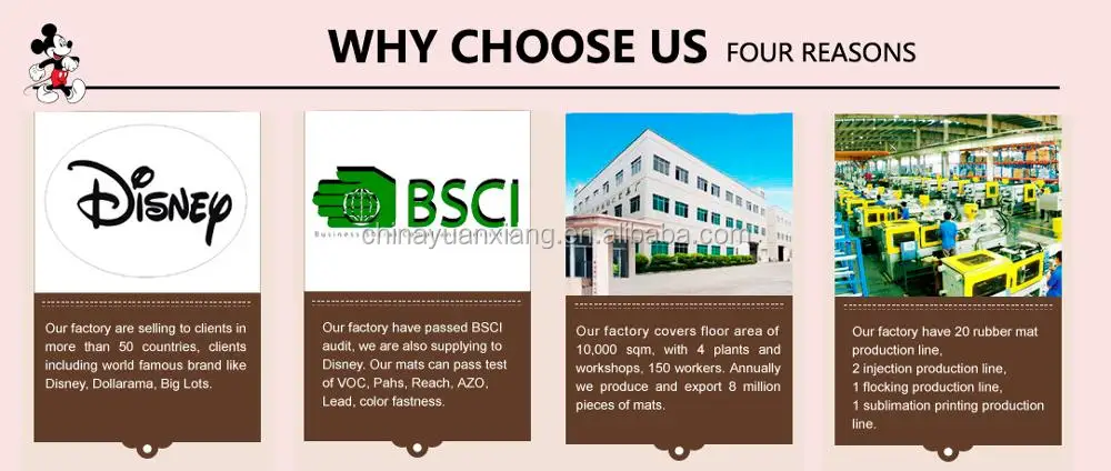 Sanmen Yuanxiang Plastics & Rubber Co., Ltd. specializes in the production, R&D, distribution and exportation of door mats, floor mats, car mats, car floor mats and bath mats. Our products have been exported to the USA, the EU, Japan and the Middle East. Yuanxiang, as a brand, has been accepted and welcomed by western market.