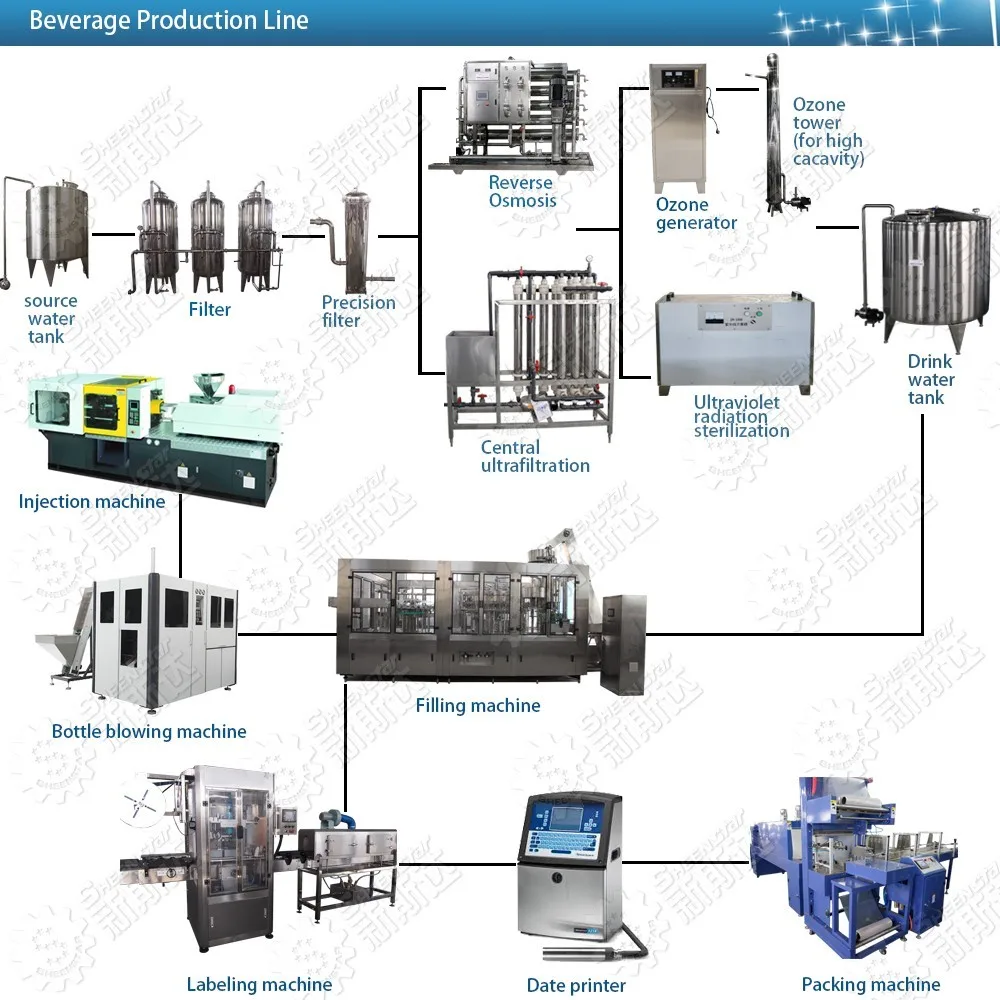 Our bottled drinking water production line mainly consists of 5 parts. They are respectively: