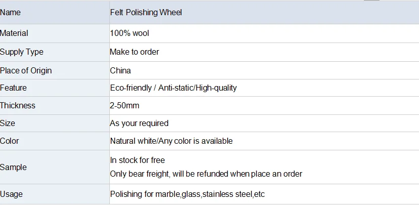 1)Felt polishing wheel use the imported wool as raw materials, which Not only hair white and delicate tissue closely, and with high High wear resistance.