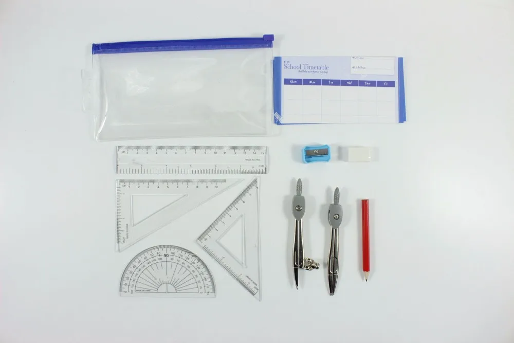 1 x compass , 1 divider, 4 x plastic rulers, 1 x HB pencils, 1 x eraser, 1 x sharpener,1 timetable