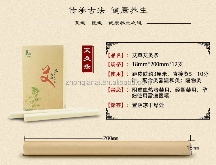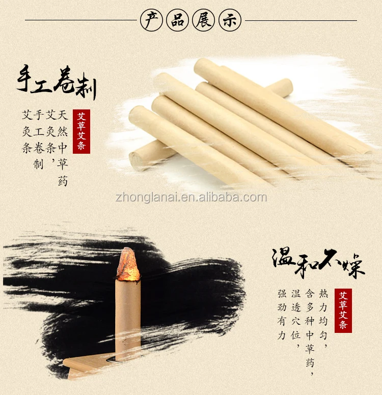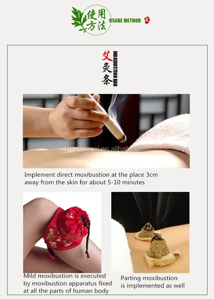 Moxibustion is a therapy which treats and prevents diseases by means of moxa wool, the main material in the therapy in the forms of moxa cones or sticks.Chinese traditional packed moxa rolls are used for indirect moxa heat treatment. Supplement Qi and activate Blood circulation;Relieving rheumatism and cold, invigorating blood circulation and stopping pains. Eliminating pathogens from the body and so on.
