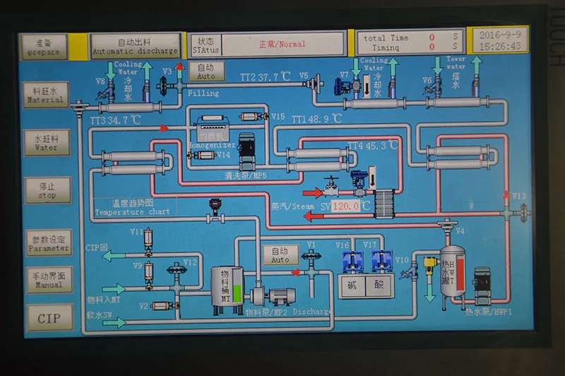 SHANGHAI NANCHENG -UHT tube type high temperature sterilization machine M-UHT tube type sterilization is widely used for liquid food "aseptic" and "the sterile" heat treatment of automatic system, the viscosity of the products range is very big, and can adapt to the fibers and particles. The company's UHT sterilization machine series production capacity can be from 10L~ 20000L/h, typical of the sterilization temperature of 90 ~ 140 ℃, be able to connect any filling machine, aseptic or other types of), sterilization machine control system installed in the chassis, control without a all adopt the international famous brand products, including PLC program controller and engineering control screen, steam pressure reducing valve and regulator, the purge valve, valve, material pump, voltage hot water pump, valve and pipe by other items such as all the accessories selects high fluid quality and high reliability. The sterilization machine design for precision products/water temperature control. Products from balance pump into the pot, preheat to homogeneous temperature, and preheat to 90 ~ 95 ℃, the stability of the milk proteins, and then super high temperature sterilization, finally cooled to filling temperature, the system with hot water sterilization is the circuit, saving energy source section. The pipe diameter. Shape (straight or corrugated) and the choice of the products by bundle need to decide, each group of heat exchanger just six O form washer (only in the medium and each year just a second look, can choose hot filling, add 90 ℃. Economic processing means, can be used to receive the same unit semi-automatic the effect.