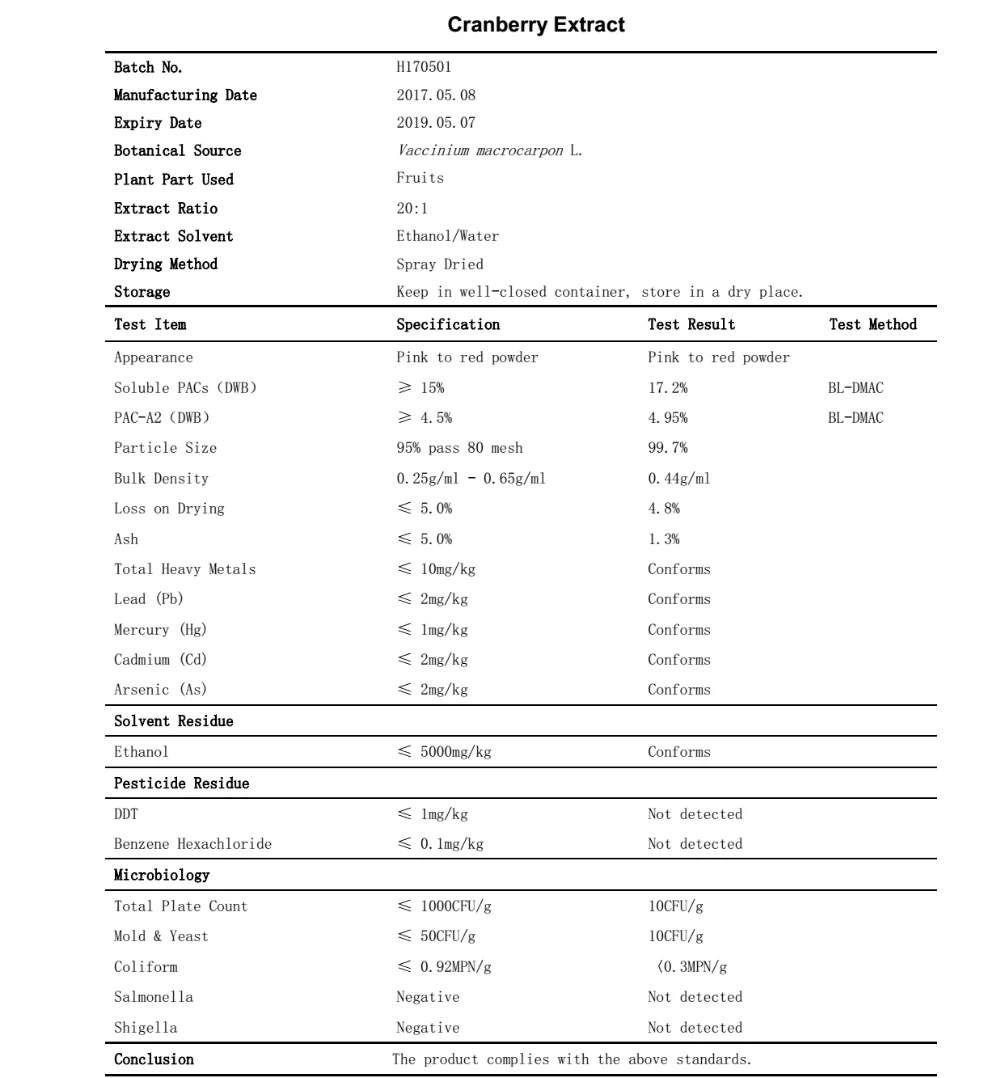 | Product Name | Cranberry Extract Powder | Botanical Name | Vaccinium Macrocarpon L. |