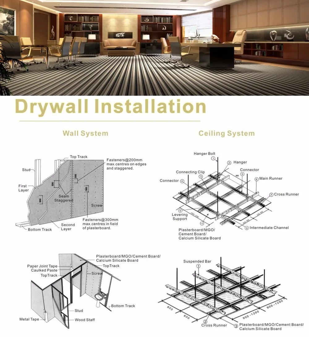 4.One-layer gypsum board is used , the space between two gypsum plaster boards should be staggered. And the double-gypsum board is used the space between two gypsum plaster boards should also be staggered.