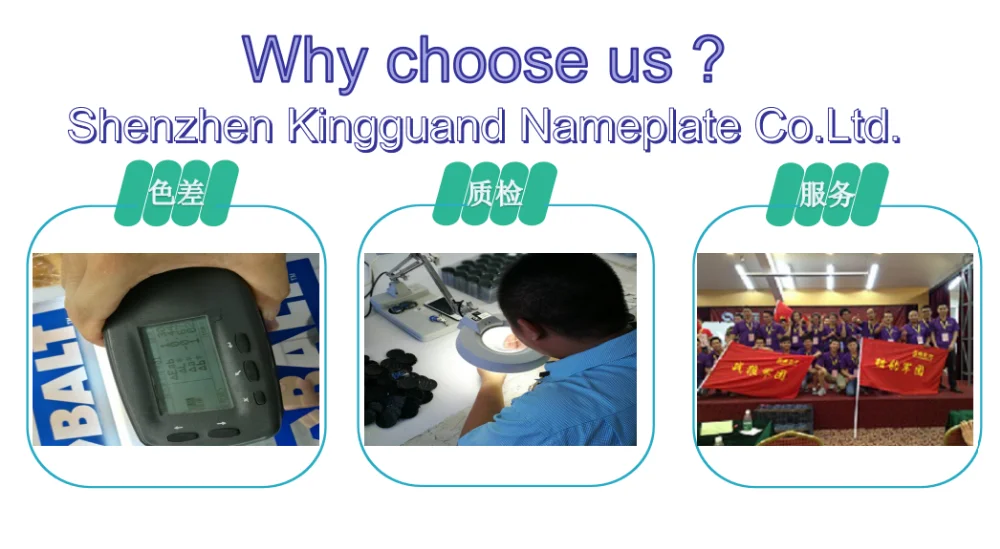 Shenzhen Kingguand Nameplate Co., Ltd., founded in 2003, is located in Shenzhen , Guangdong province,specializing in the research, development and production of various kinds of metal nameplates, sign boards gift packing and metal products. The company obtained the ISO90001 and ISO14000 international quality certificates.