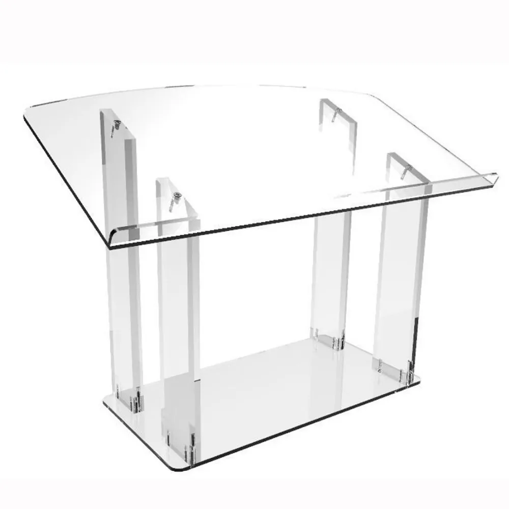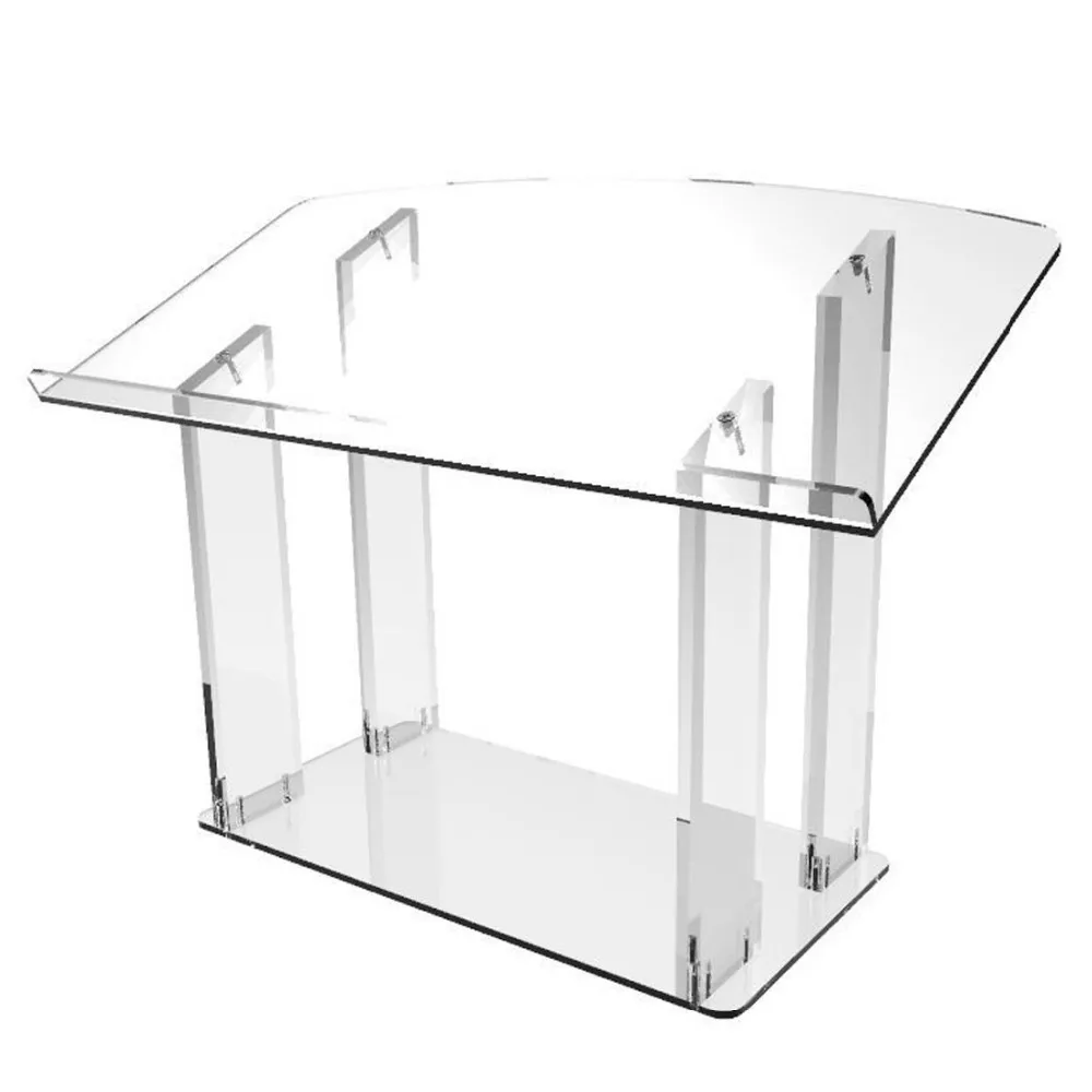 This beautiful clear tabletop/desktop lectern podium pulpit features 1/2" base, top and four 3/4" legs for superior stability. Ideal for churches, hotels, universities, colleges and conference centers, where a outstanding acrylic, podium, pulpit, lectern is needed. Also perfect for a small room presentation.
