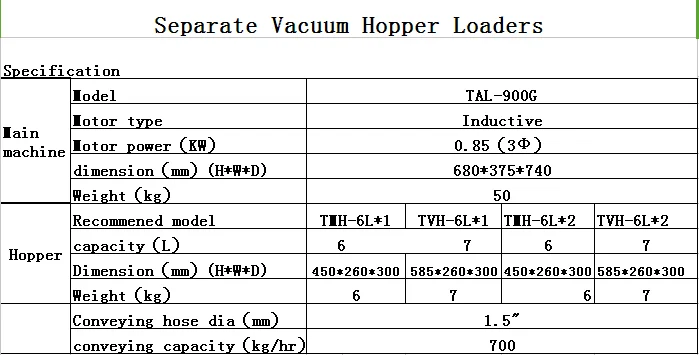 Sperate-vacuum hopper loaders are suitable for conveying material over long distance,the material hopper is installed away from the main unit and use of a stainless steel hopper eliminates material contamination,superior suction power is continuously available from the high efficient vacuum blower.Each model is completed with motor overload protector to prolong its life,and is also fitted with a material shortage alarm.