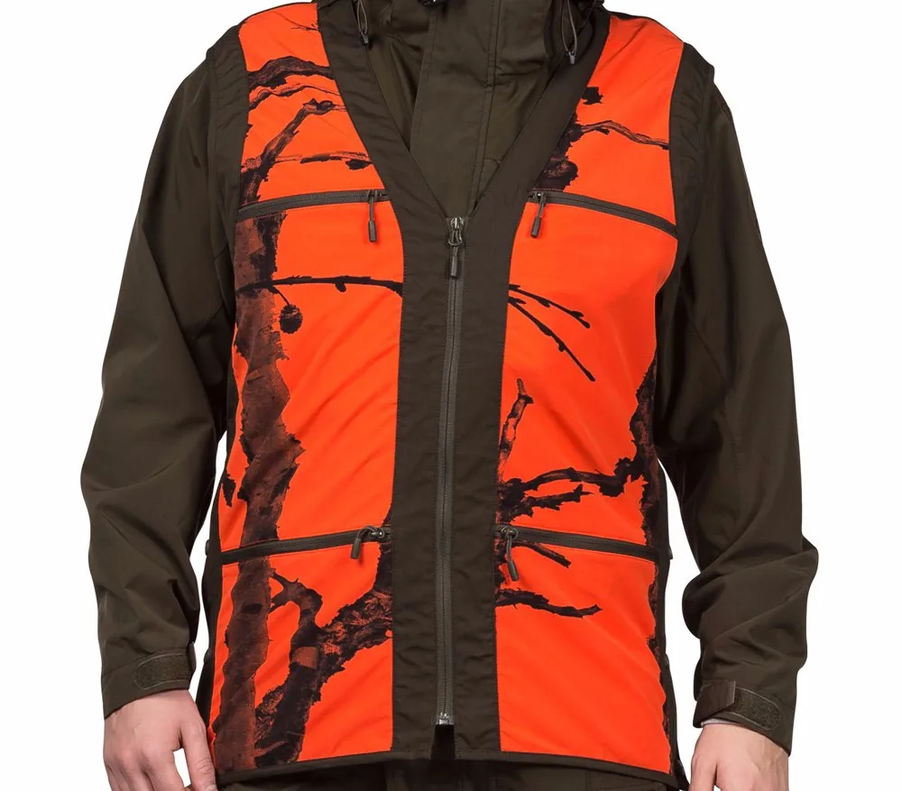 Details: | 4-way stretch. Internal elastic loop for wire and antenna loops on the shoulders. Orange camouflage pattern for increased security. Game pocket at the back. Front pockets, hunting radio/GPS pocket on chest, internal pockets in front, and game pocket. Side split with buttons for easier access to clothing underneath. |