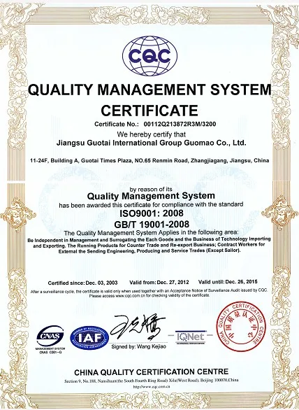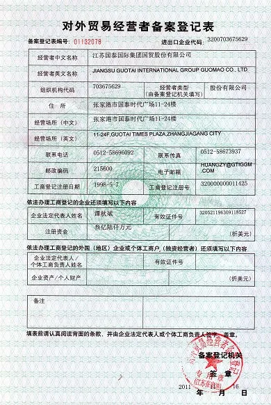 Jiangsu Guotai International Group Guomao Co., Ltd , with a registered capital of 544 million RMB , was founded by the approval of the people’s government of Jiangsu Province in 1998. The main business scope involves import & export , such as textile, garment, tools, light industry and chemicals, and labour dispatchment. Guomao’ stock name is Jiangsu Guotai, and stock code is 002091.
