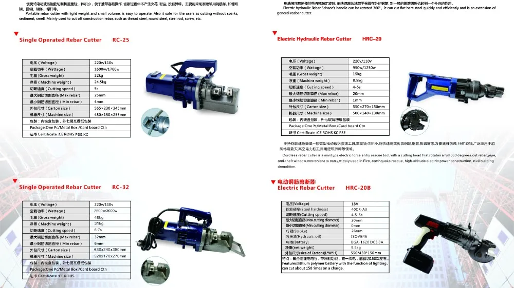 -Portable rebar cutter with light weight and small volume, is easy to operate. Also it safe for the users as cutting without sparks, Sediment,Smell. Mainly used to cut off construction rebar, such as the thread steel, round steel, steel rod, screw, ect.