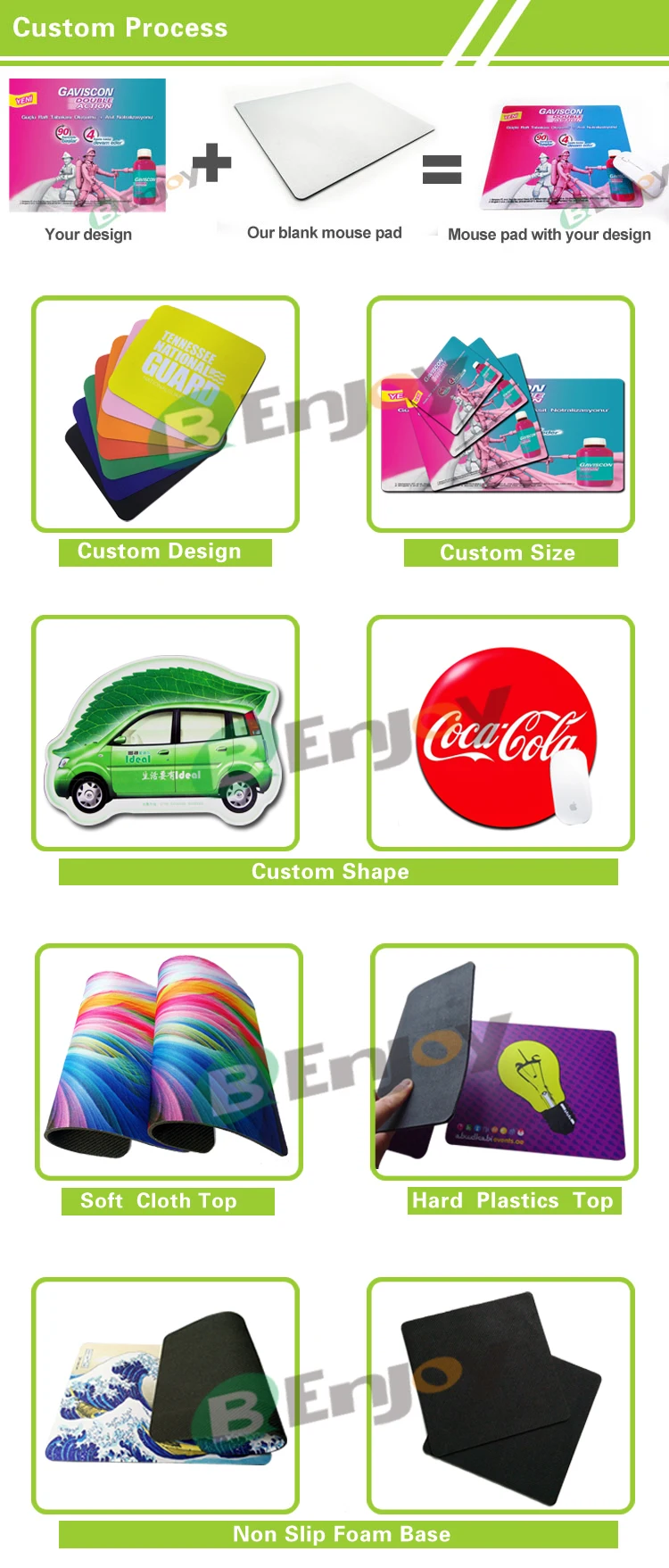 Established 2009,DongGuan B-Enjoy Crafts Co.,Ltd is a enaction enterprise with Sales,Research and manufacturer, professionally in the Industry of Gaming Mouse Pad ,Office Mouse Pad ,Promitional Mouse Pad ,Ergonomic Mouse Pad,Wist Rest Mouse Pad,3D Sexy Mouse Pad,Mouse Mat,Mousepad,Desk Mat,Counter Mat,Bar mat ,Anti-slip Car Pad and many Other Good &New Crafts . We are working very hard to provide best products and perfect service to our clients. More friends and partners are warmly welcome to building trusting relationship with us.