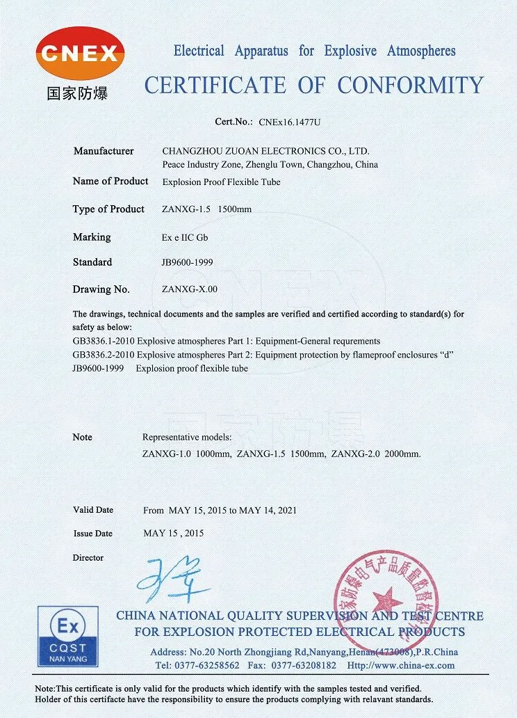 ZANXG, it is explosion proof flexible tube. Zuoan explosion proof flexible tube has get CNEx explosion proof certificate, and SGS certificate( RoHS Directive (EU)2015/863 amending Annex II to Directive 2011/65/EU.