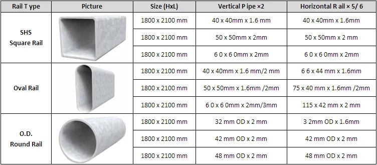 | 115 X 45 Rails 50 X 50 RHS Posts 1600 High 3200 Long 5 Rail 1800 High 3200 Long 6 Rail | 66 X 44 Oval Rails 50 X 50 RHS Posts 1600 High 3200 Long 5 Rail 1800 High 3200 Long 6 Rail | 53 X 35 Oval Rail 40 X 40 Rhs Posts 1600 High 3200 Long 5 Rail 1800 High 3200 Long 6 Rail |